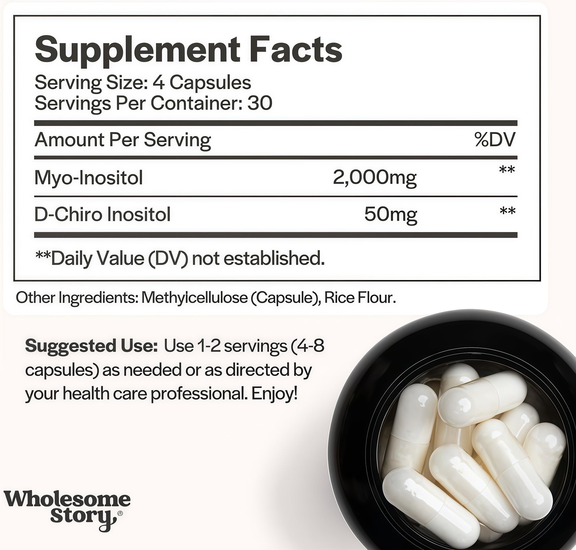 Take 1–2 servings (4–8 capsules) daily, or as directed by your healthcare professional. Each 4-capsule serving provides 2,000 mg of Myo-Inositol and 50 mg of D-Chiro Inositol. Each bottle contains 30 servings.